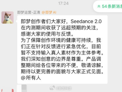 据悉,有官方运营人员表示:“即梦创作者们大家好,Seedance 2.0 在内测期间收获了远超预期的关注,感谢大家的使用与反馈。为了保障创作环境的健康可持续,我们正在针对反馈进行紧急优化,目前暂不支持输入真人素材作为主体参考。我们深知创意的边界是尊重。产品调整期间给各位带来的不便,敬请谅解,期待以更完善的面貌与大家正式见面。”