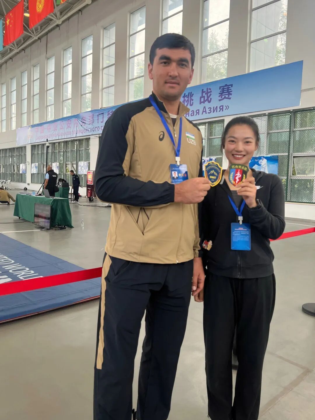叶霞与乌兹别克斯坦参赛队选手加尼耶夫合影。法治日报全媒体记者 张晨 摄